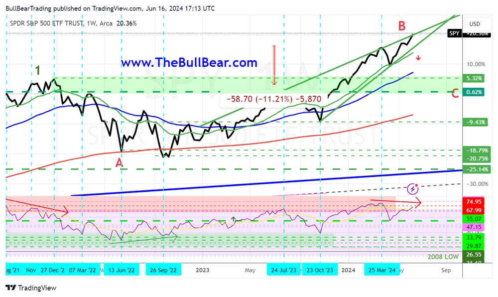 I see an anticipated long-term B-wave high followed by C-wave correction in a larger scale sideways pattern, with a potential -25% decline for the Dow.