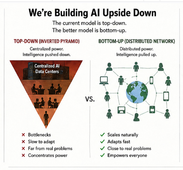 Centralized, top-down AI vs distributed, bottom-up intelligence that scales at the edge.