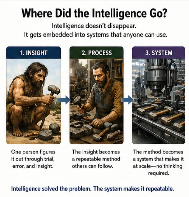 Intelligence doesn’t disappear—it gets embedded into processes that anyone can use.